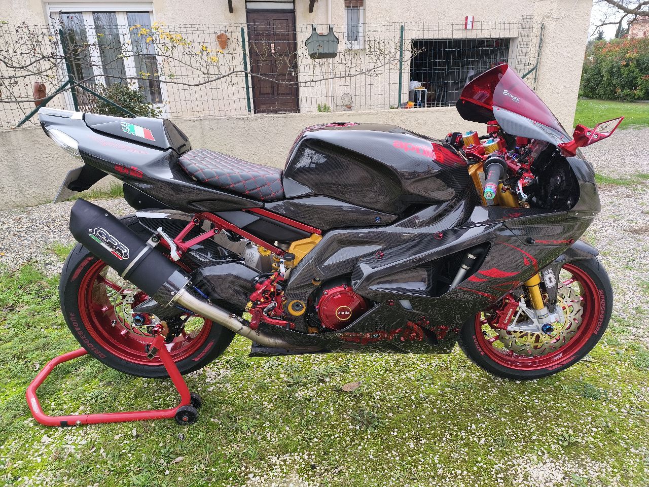 APRILIA RSV 1000 factory full carbone, carénages complets en carbone, le reservoir a été recouvert de carbone (ce n'est pas du covering mais bien du carbone) car impossible de trouver un reservoir de RSV NERA sur le net. tout est neuf: roulements et joints de roues, stator, régulateur, disques de freins AV et AR, plaquettes, leviers freins et embrayage, cylindre de frein AR, kit chaine complet, pneus AV et AR, batterie au lithium... échapements GPR FURORE inox homologués, avec un son fabuleux durites de frein avant et arrière aviation tressées rouge, une grande partie de la boulonnerie est en titane colorée. toutes les vis creuses de frein sont en titane rétroviseurs RIZOMA repeints, bocaux de freins RIZOMA cales de roues arrière EVOTECH bulle ERMAX minis clignotants avant LED (rajout de résistances pour le clignotement lent) poignées DOMINO accélérateur à tirage rapide DOMINO avec câble neufs la fourche à été refaite et le traitement chimique des tubes également le compteur a été remplacé car l'ancien avait un défaut: le compte tours, et les voyants de clignotants ne fonctionnaient plus. Mais j'ai la photo de l'ancien compteur pour prouver le kilométrage. moto rabaissée de 30 mm, poignées rehaussées de 40 mm nombreuses pièces repeintes en rouge commandes reculées la vidange a été faite, bougies neuves, filtre à air racing les jantes ont été thermolaquées gris et un vernis candy rouge a été appliqué le contrôle technique est récent et zéro défauts carte grise à mon nom, nombreuses photos sur demande Je possède toutes les factures ou preuves d'achat PRIX FERME