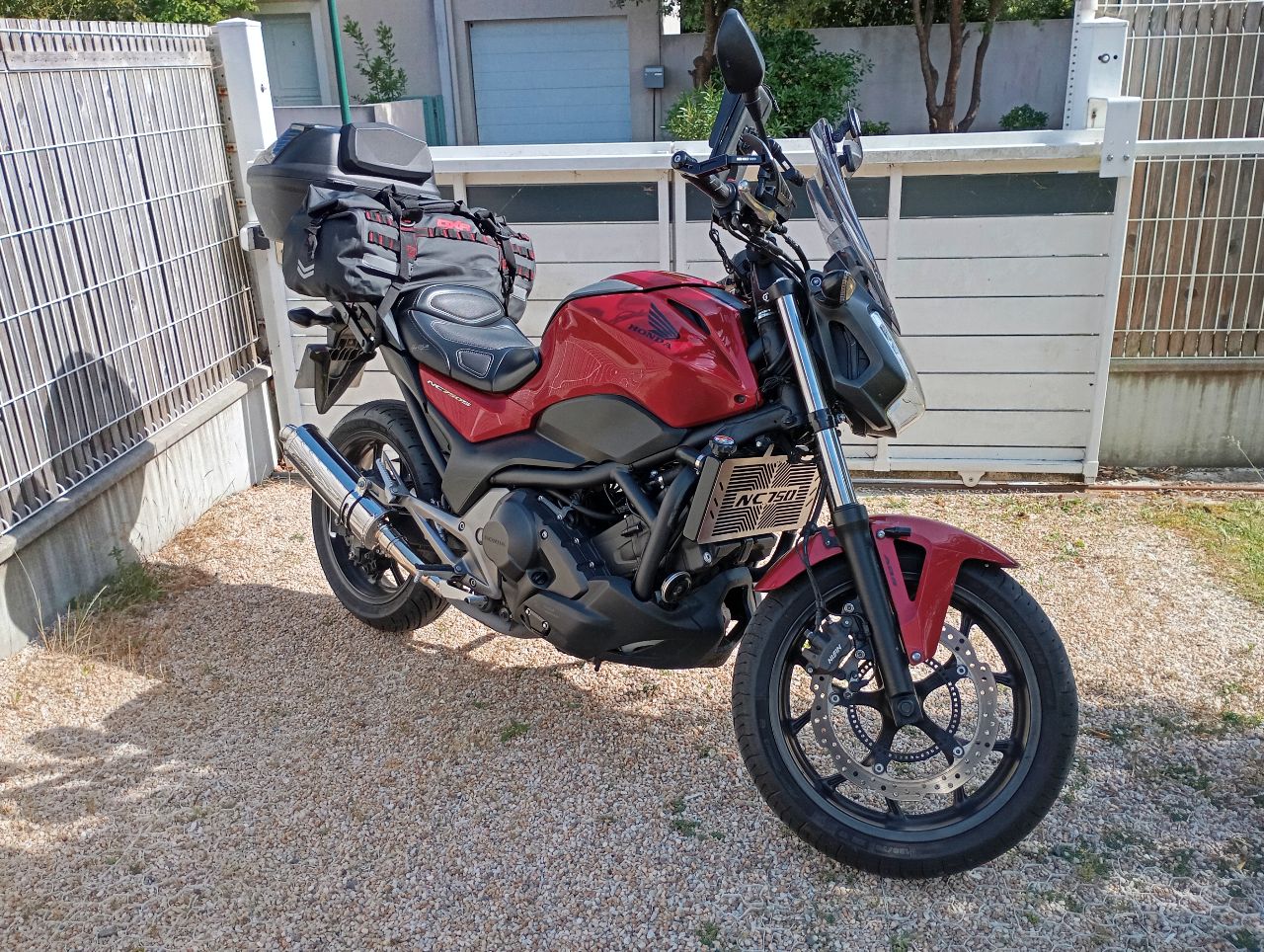 MOTO aussi pratique qu'un TMAX moteur de 750 cc 55cv et un gros couple immédiat Coffre 22 litres à la place du réservoir Aucun frais à prévoir Options installées Protège main Oxford aluminium Grille radiateur nc750 inox Pied de béquille latérale nc750 Échappement Delkevic plus origine Bulle haute Puig Selle confort Gel Yves Moillot Top case Givi 3 modes de conduite normal/sport et séquentielle (manuel) Très faible consommation (3,5 l) Raison de la vente double emploi Moto basse idéal 1.60 m/1.80m moteur Honda increvable Négociable raisonnablement
